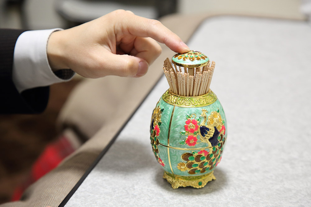 ネットで話題になったというタイの爪楊枝入れ。上のフタを押すと花のように広がって爪楊枝が現れるギミックが素敵。「爪楊枝はそんなに使いませんね」。